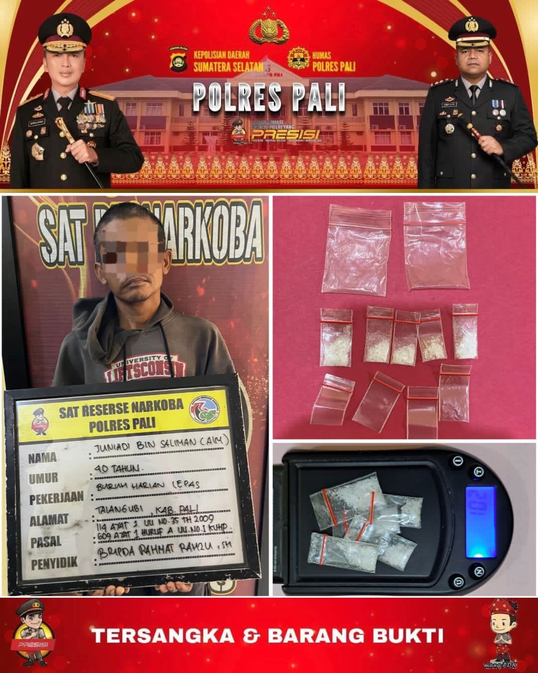 Barang bukti yang berhasil diamankan meliputi lima paket sabu dengan berat bruto 1,02 gram, satu kotak plastik kecil warna hijau, serta empat plastik klip kosong. Barang bukti tersebut menguatkan peran tersangka sebagai pengedar aktif dalam jaringan peredaran narkotika di wilayah Talang Ubi.