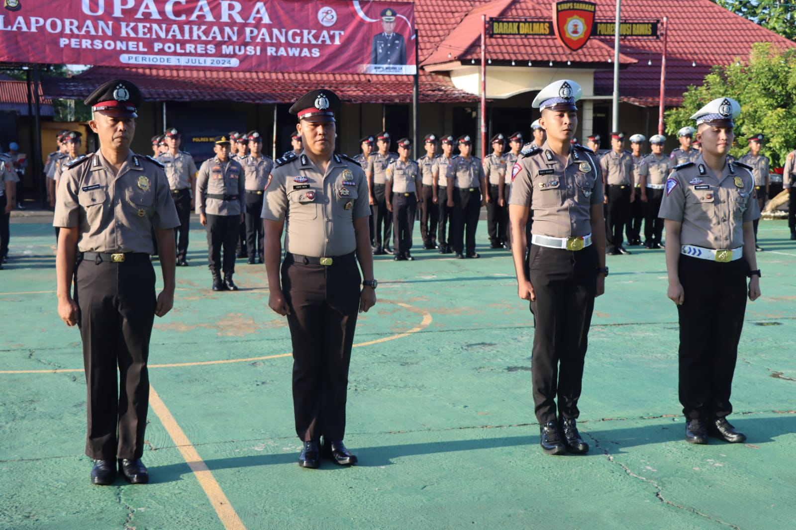 Terlihat hadir juga, Wakapolres Mura, Kompol M Harsono SH, Kabag Ops, Kompol Tony Saputra SIK, Kabag Log, Kompol Forliamzons, Kabag Ren, Kompol Diaz Oktora, para Kasat, para Kasi, para Kapolsek, ke 52 personel naik pangkat dan peserta apel beserta Pengurus Bhayangkari Cabang Mura.